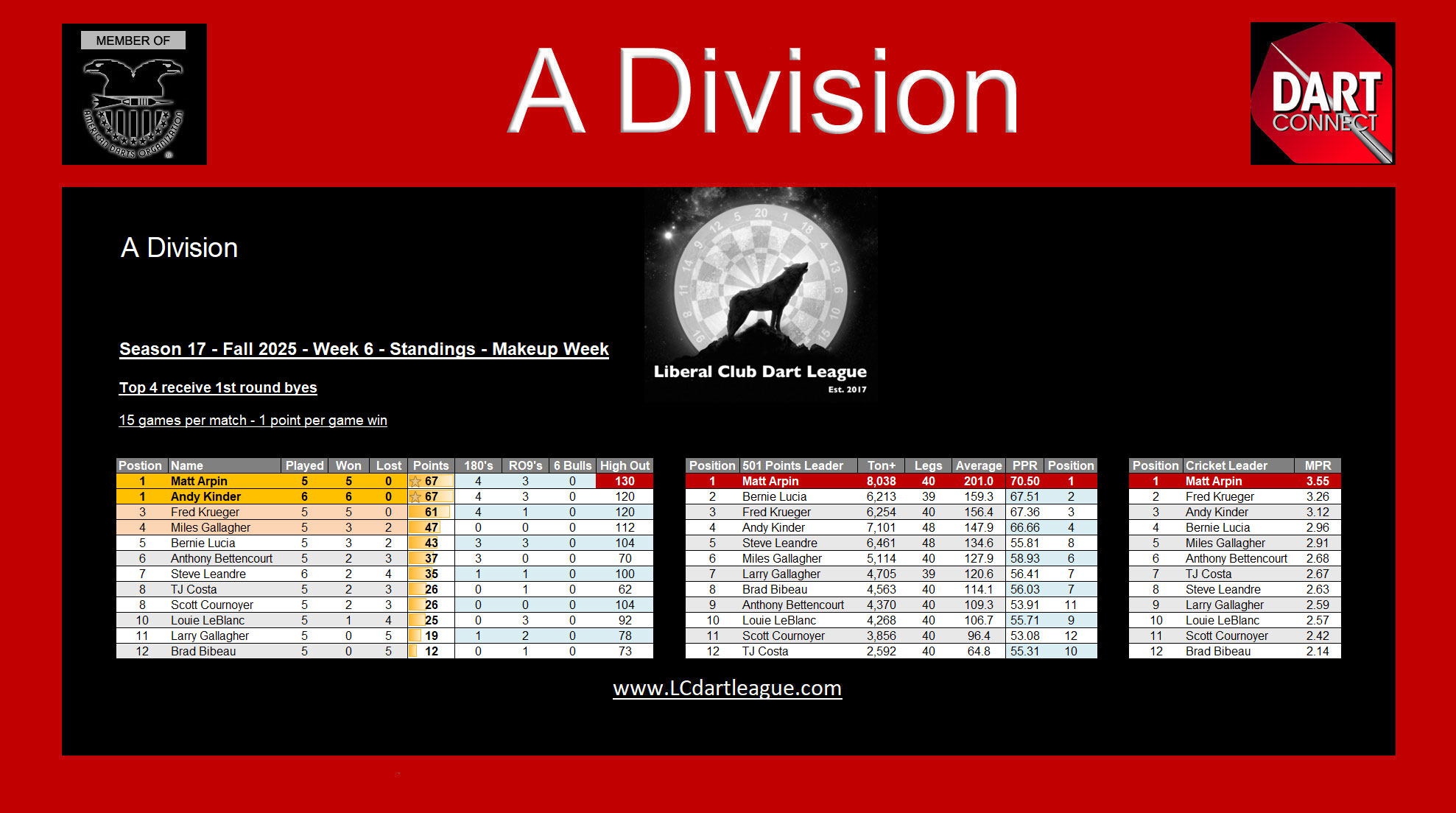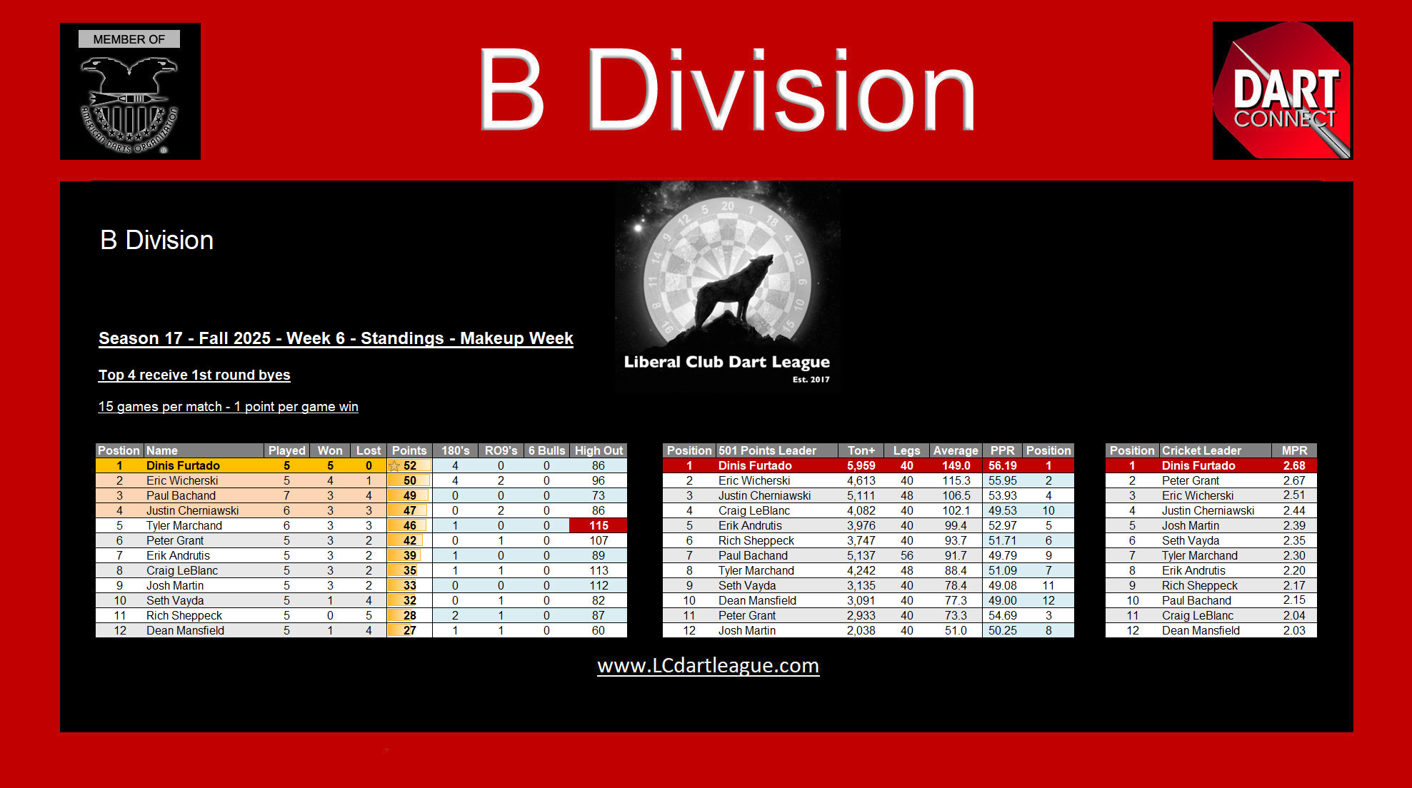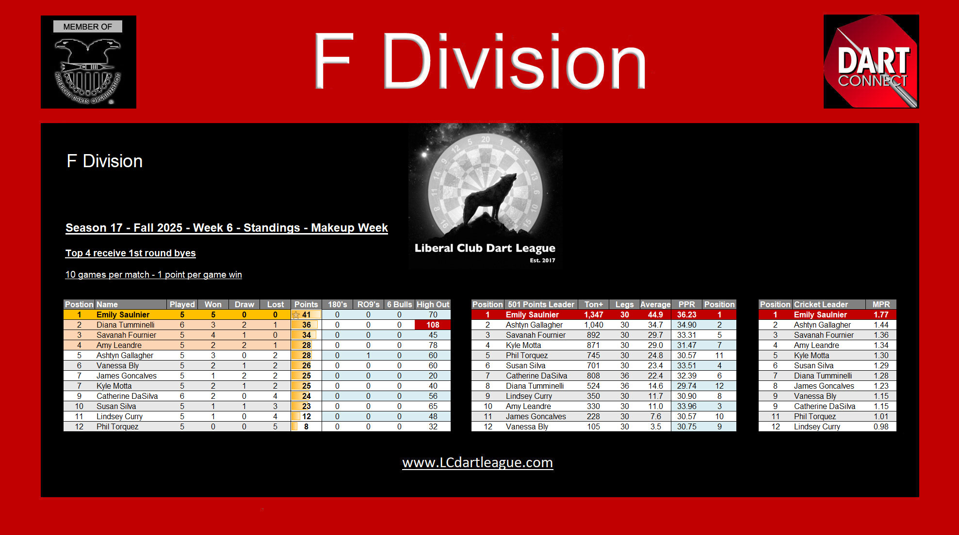 A, B, C, D, E & F Divisions League Standings for Season 17, Fall, 2025