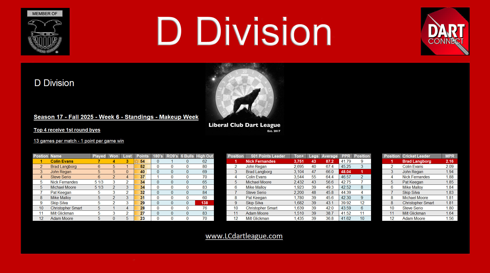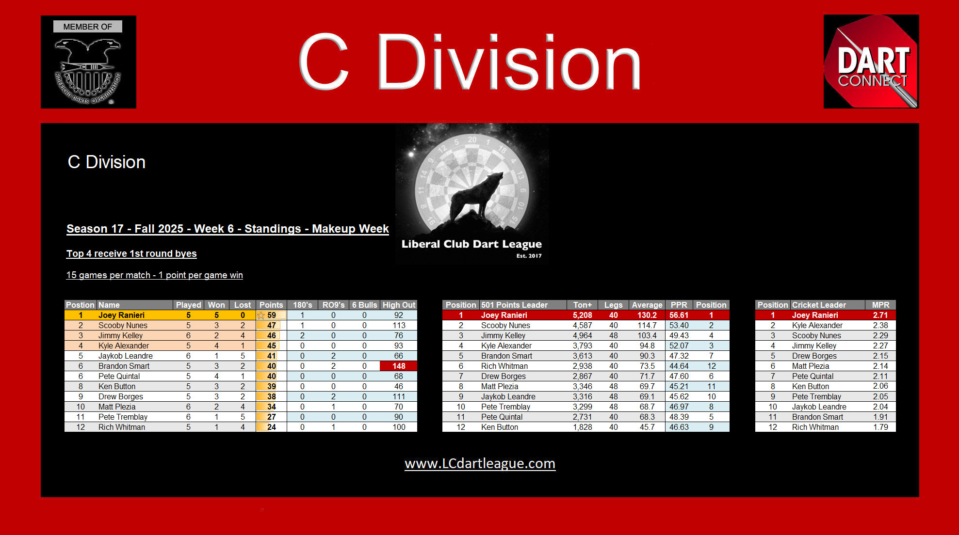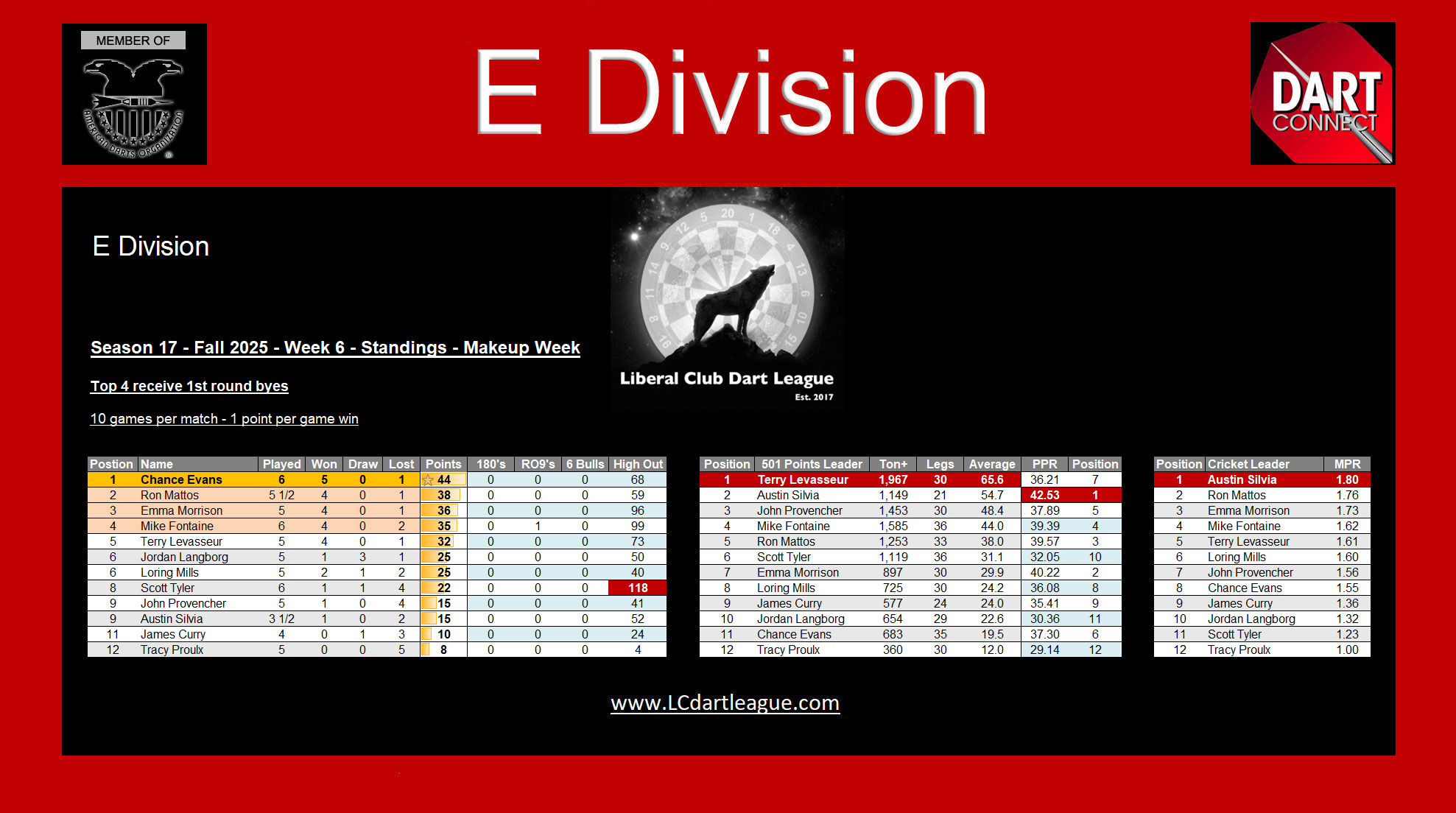 A, B, C, D, E & F Divisions League Standings for Season 17, Fall, 2025