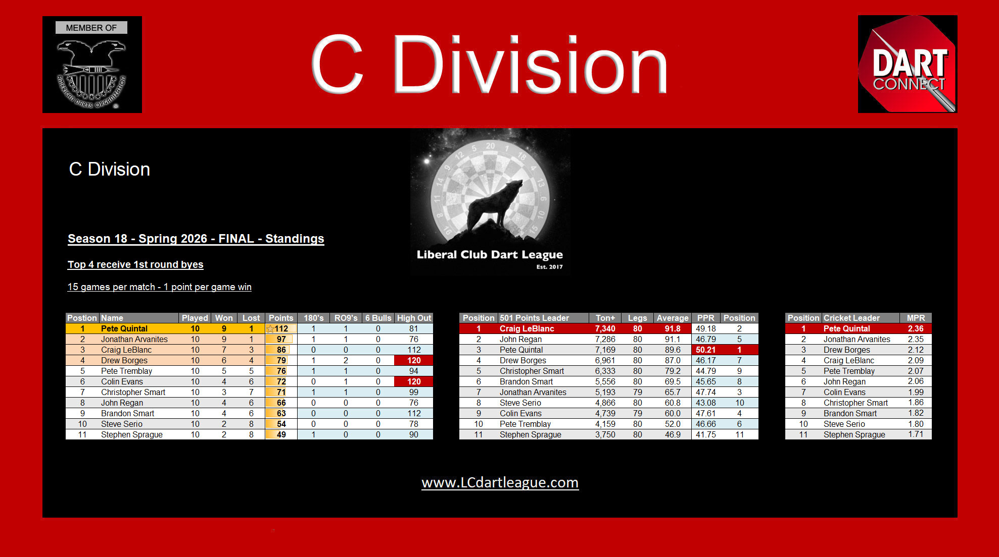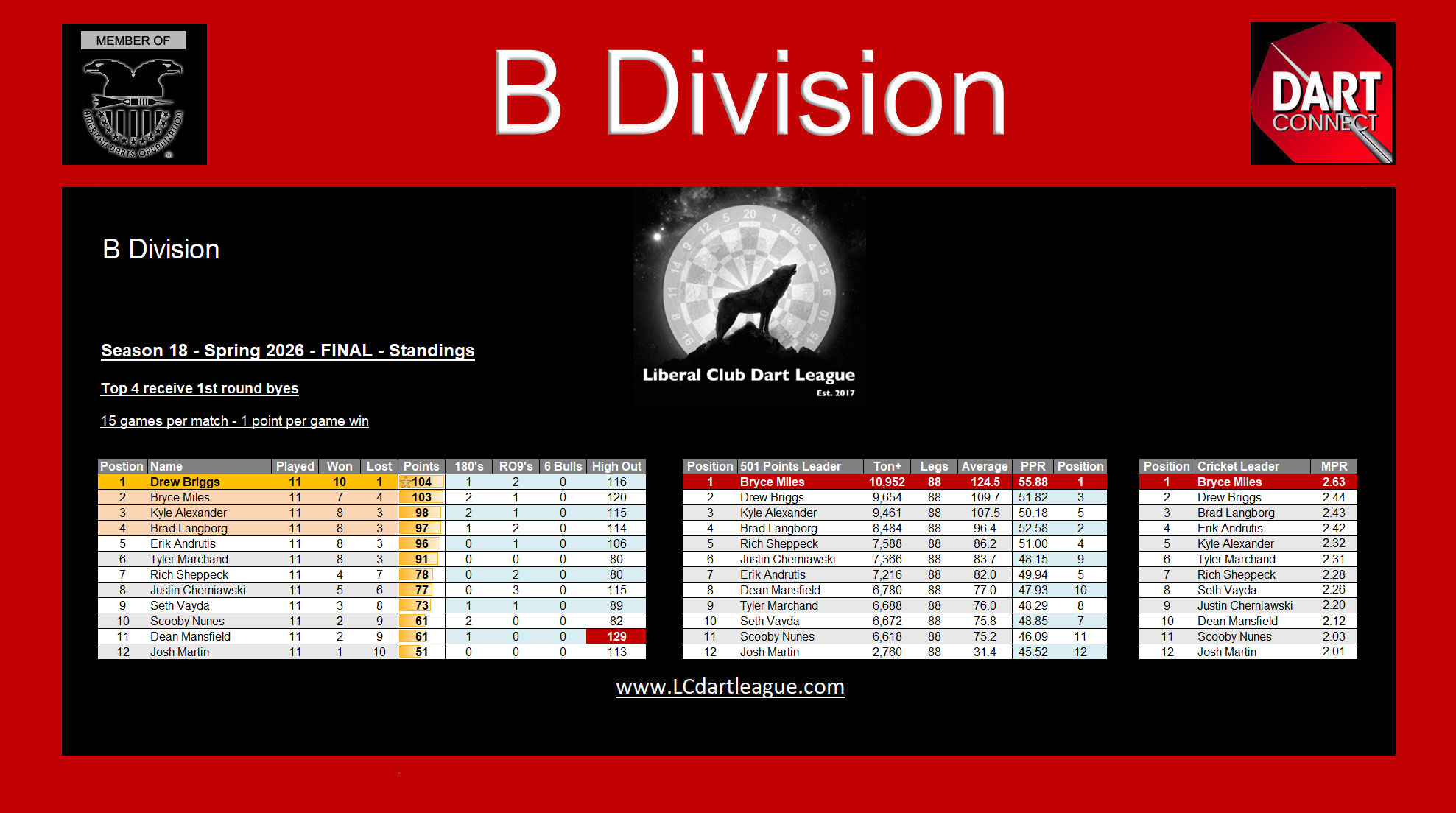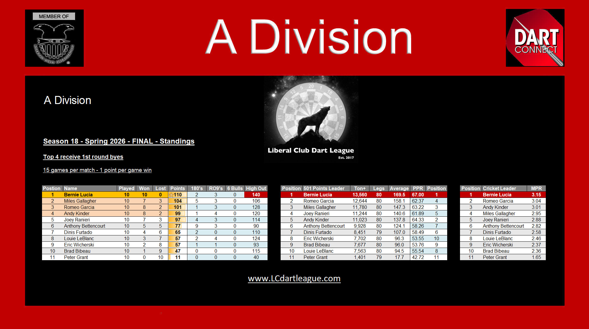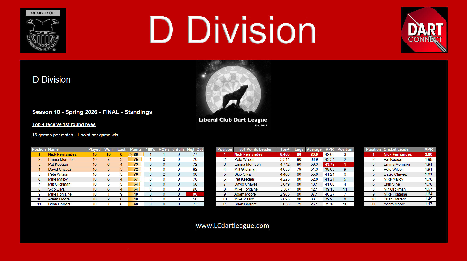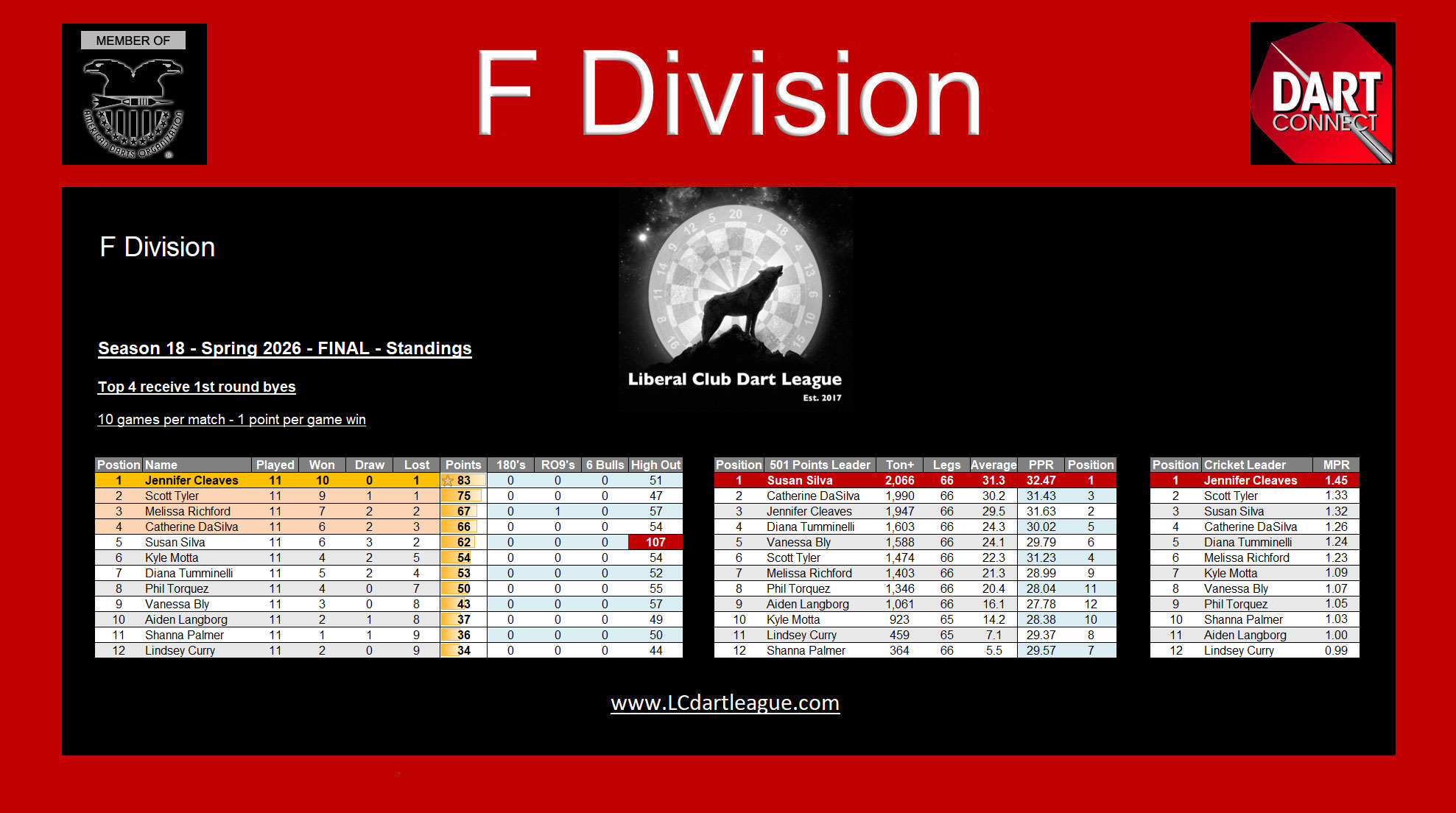 A, B, C, D, E & F Divisions League Standings for Season 18, Spring, 2026
